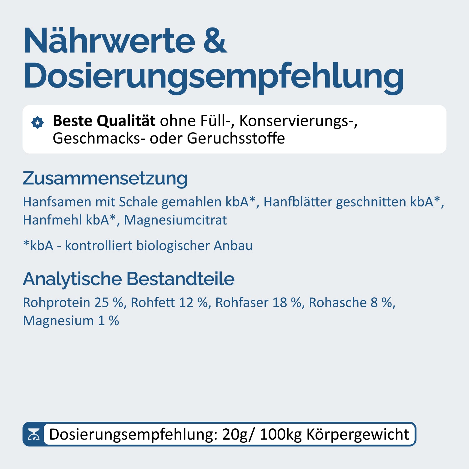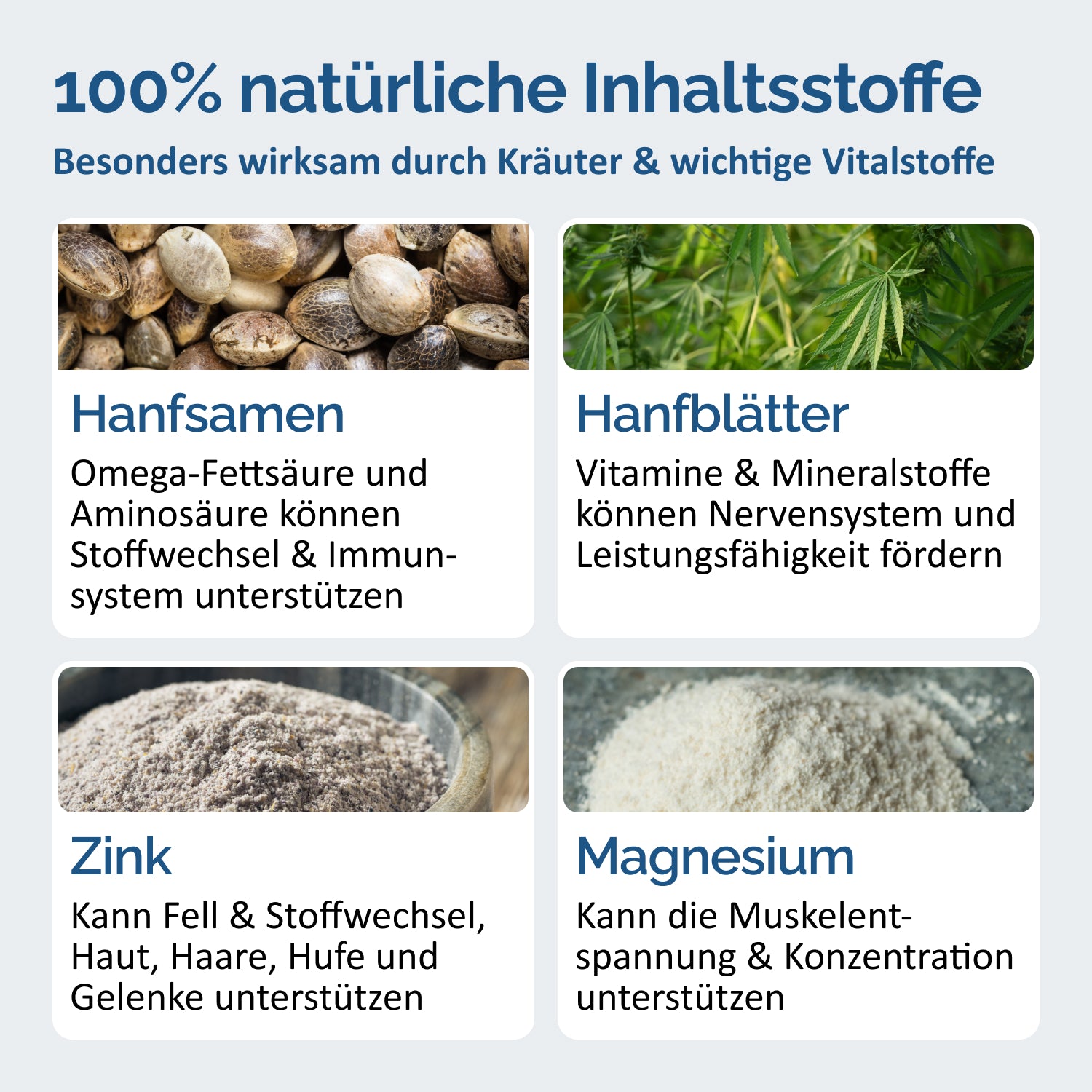 El cáñamo fue utilizado hace miles de años por los antiguos egipcios y chinos como una valiosa planta medicinal y fuente de juventud. Debido a su extrema densidad de sustancias vitales, esta planta también es llamada la “fuente de alimento más completa” del mundo. En esta mezcla única de Hemp PLUS, la planta de cáñamo más valiosa se combina con magnesio puro, que es tan importante para los caballos.