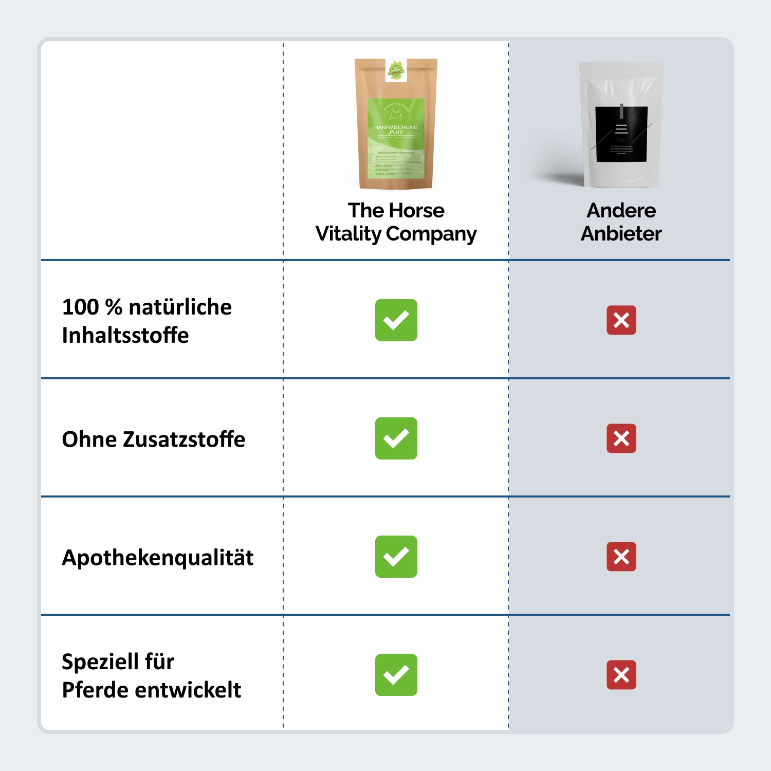 Eso depende de tu caballo. Si tiene síntomas de deficiencia o “anomalías” muy específicos, esto puede tener sentido. Sin embargo, siempre debes comentar esto con tu veterinario tratante. Normalmente hemos tenido la mejor experiencia administrando el estimulante del metabolismo o la mezcla Hemp PLUS como único alimento complementario en caballos sin deficiencias particularmente graves.