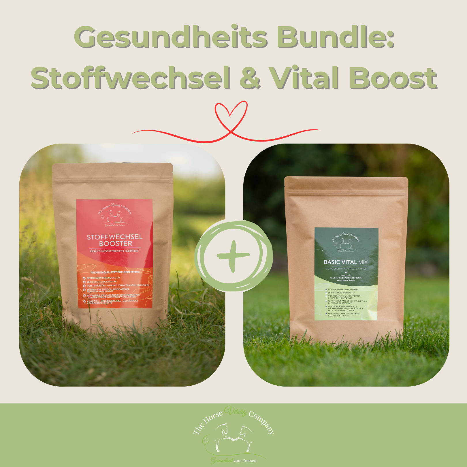 Spare mit unserem Gesundheits-Bundle -20% auf unseren bewährten Klassiker den Stoffwechsel Booster und unser Basic Vital Mix! Für alle die Ihrem Pferd was Gutes tun und vorbeugen wollen.